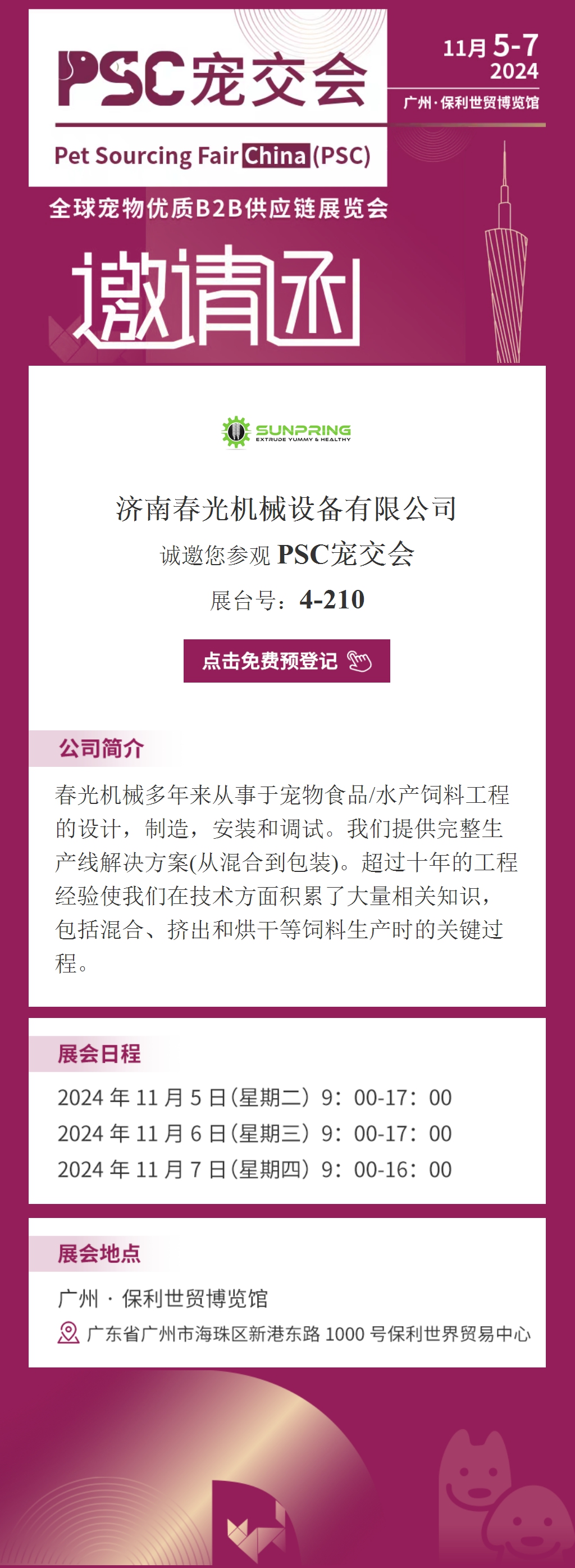 您現在的位(wèi)置:首頁> 新聞中心 > 新聞中心 >> 展會(huì)信息 >> 濟南春(chūn)光機械設備有限公司 誠邀您(nín)參觀 PSC寵交會